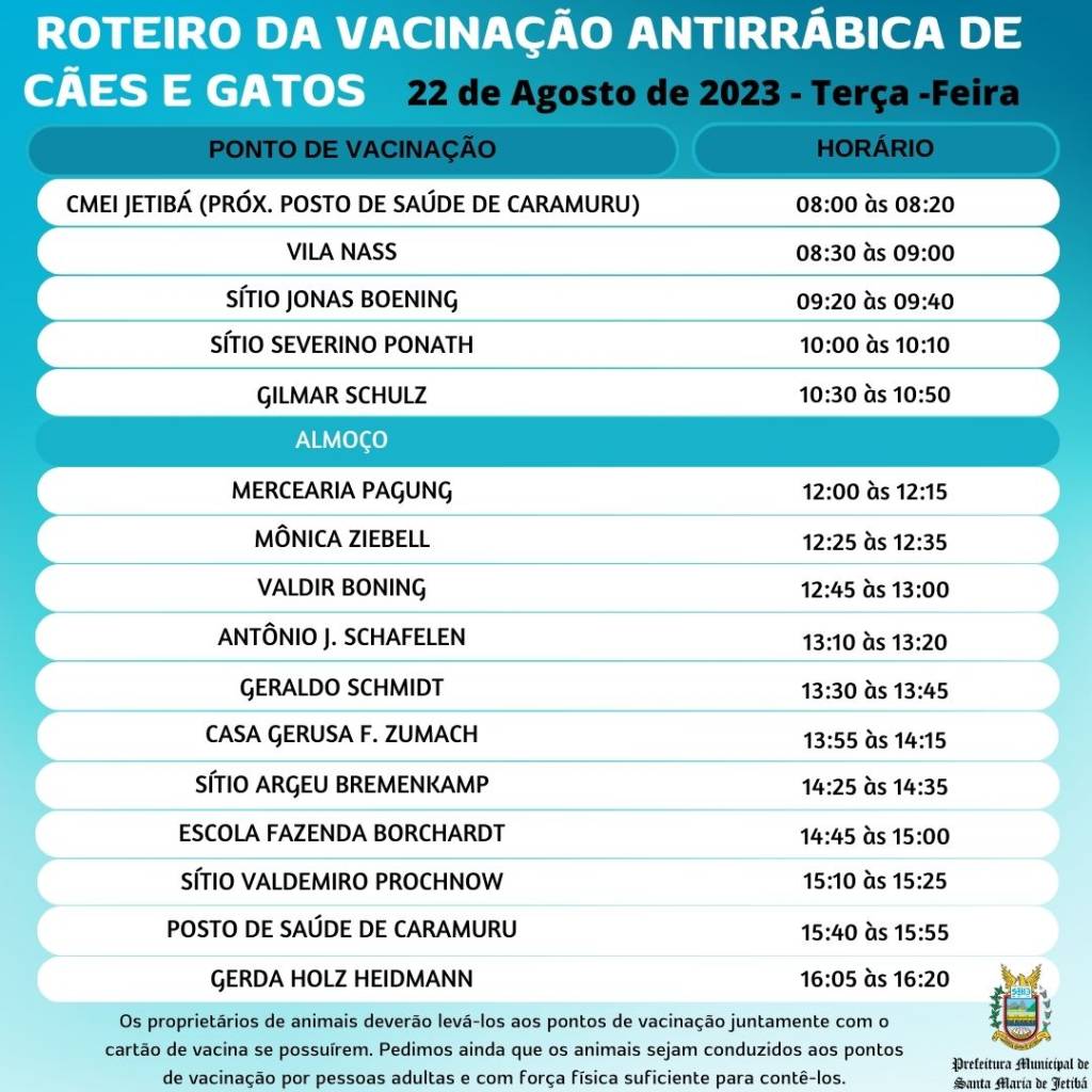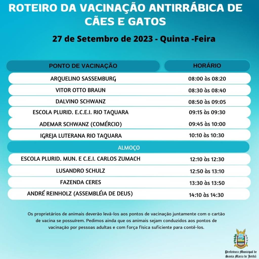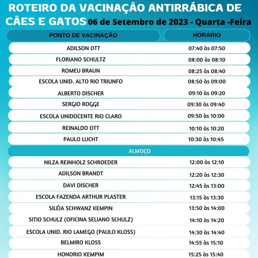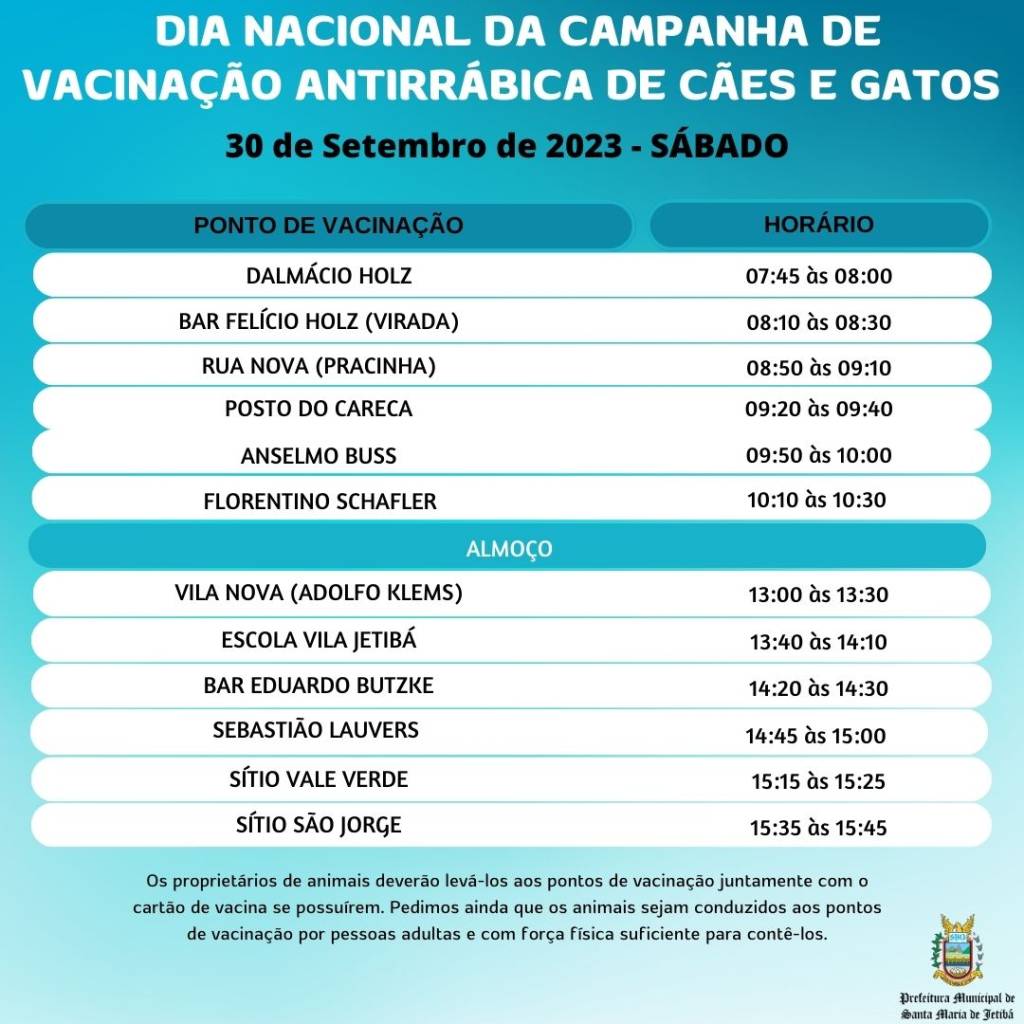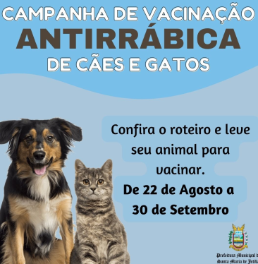 InícioNotíciasCAMPANHA DE VACINAÇÃO ANTIRRÁBICA DE CÃES E GATOS CAMPANHA DE VACINAÇÃO ANTIRRÁBICA DE CÃES E GATOS Publicado em 21/08/2023Por Secretaria Municipal de Saúde CONFIRA O ROTEIRO