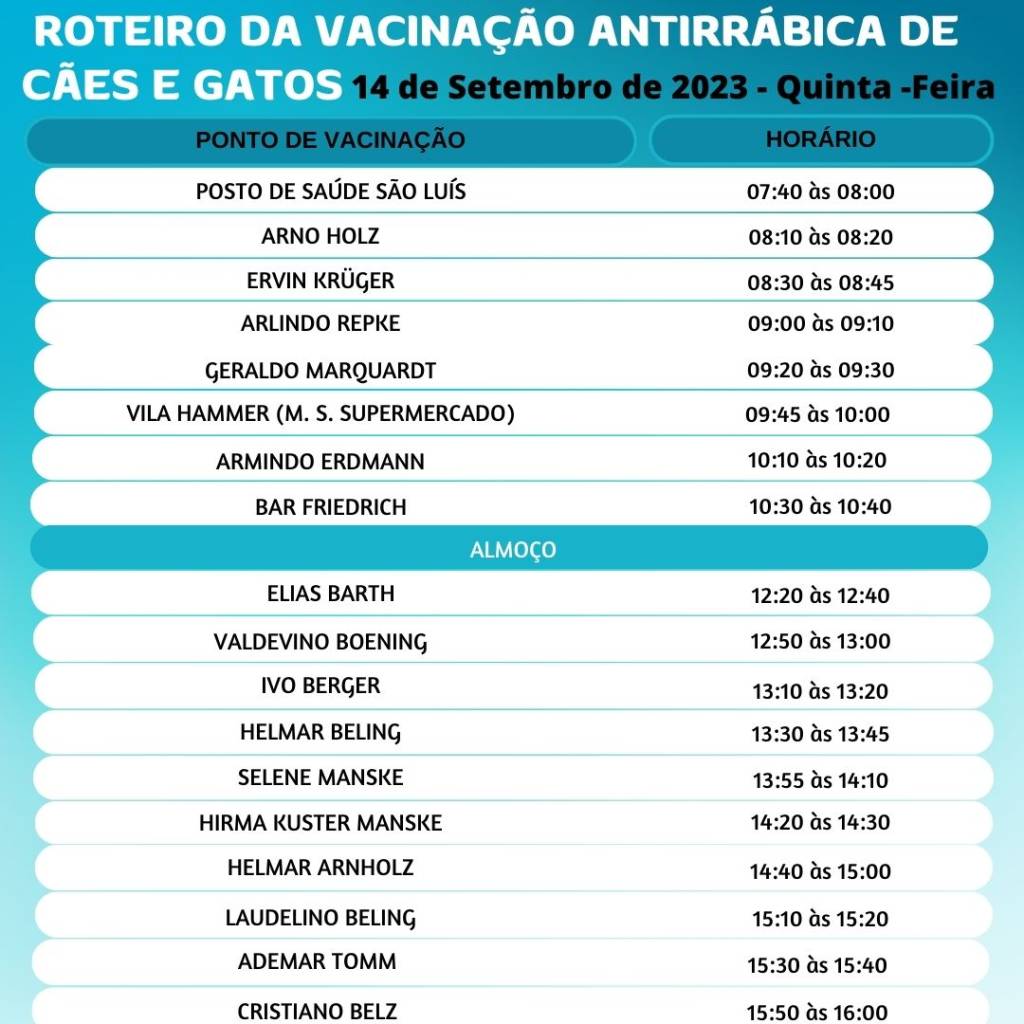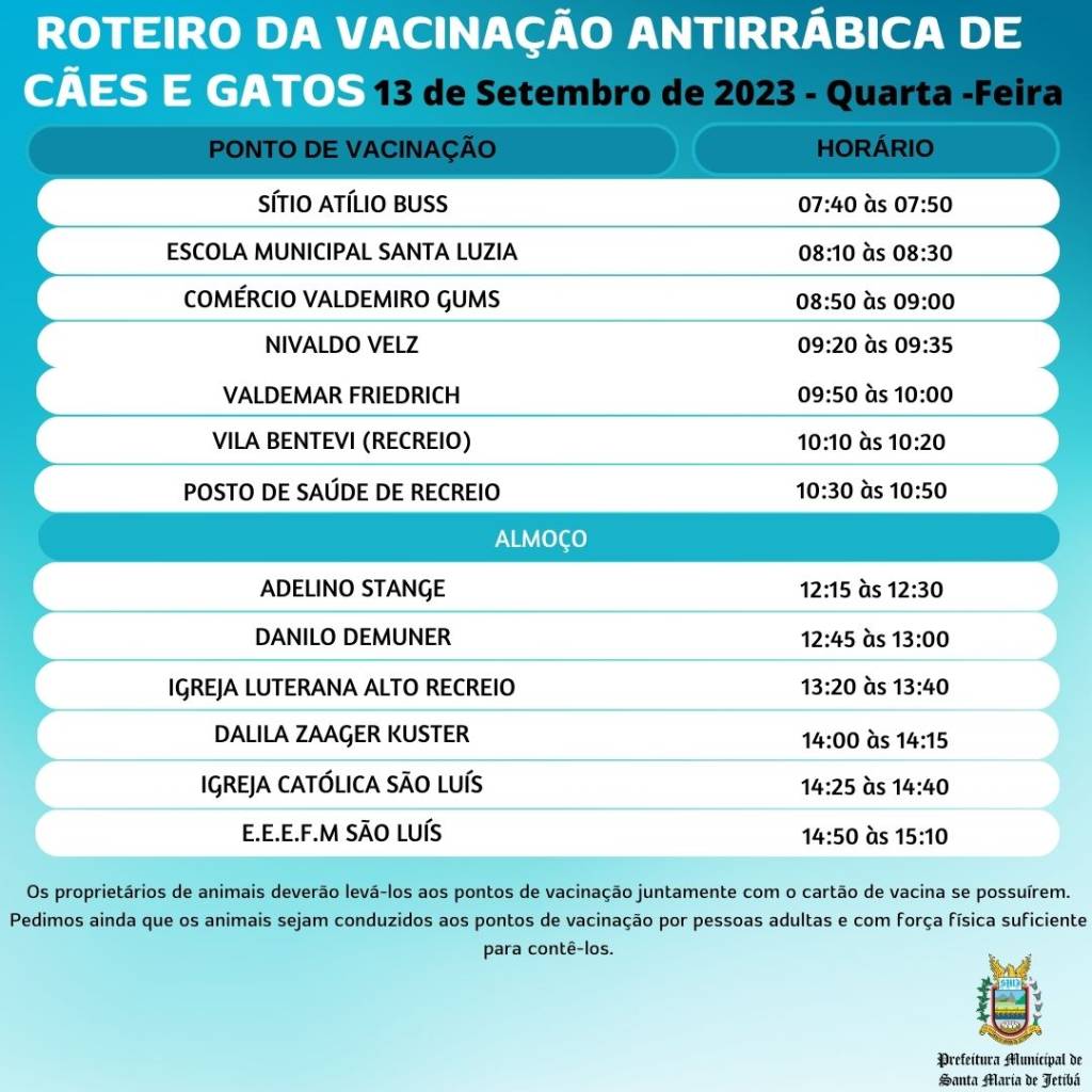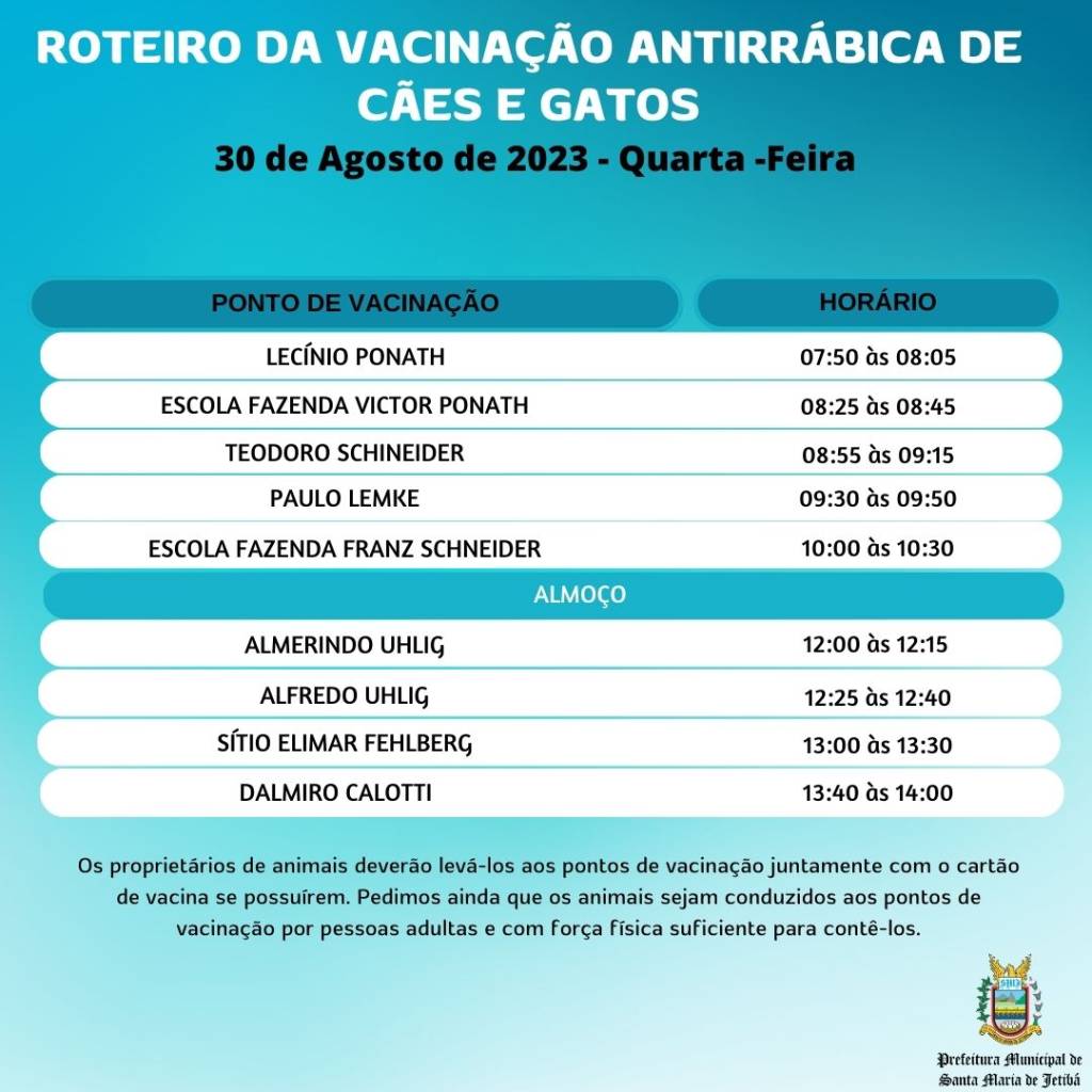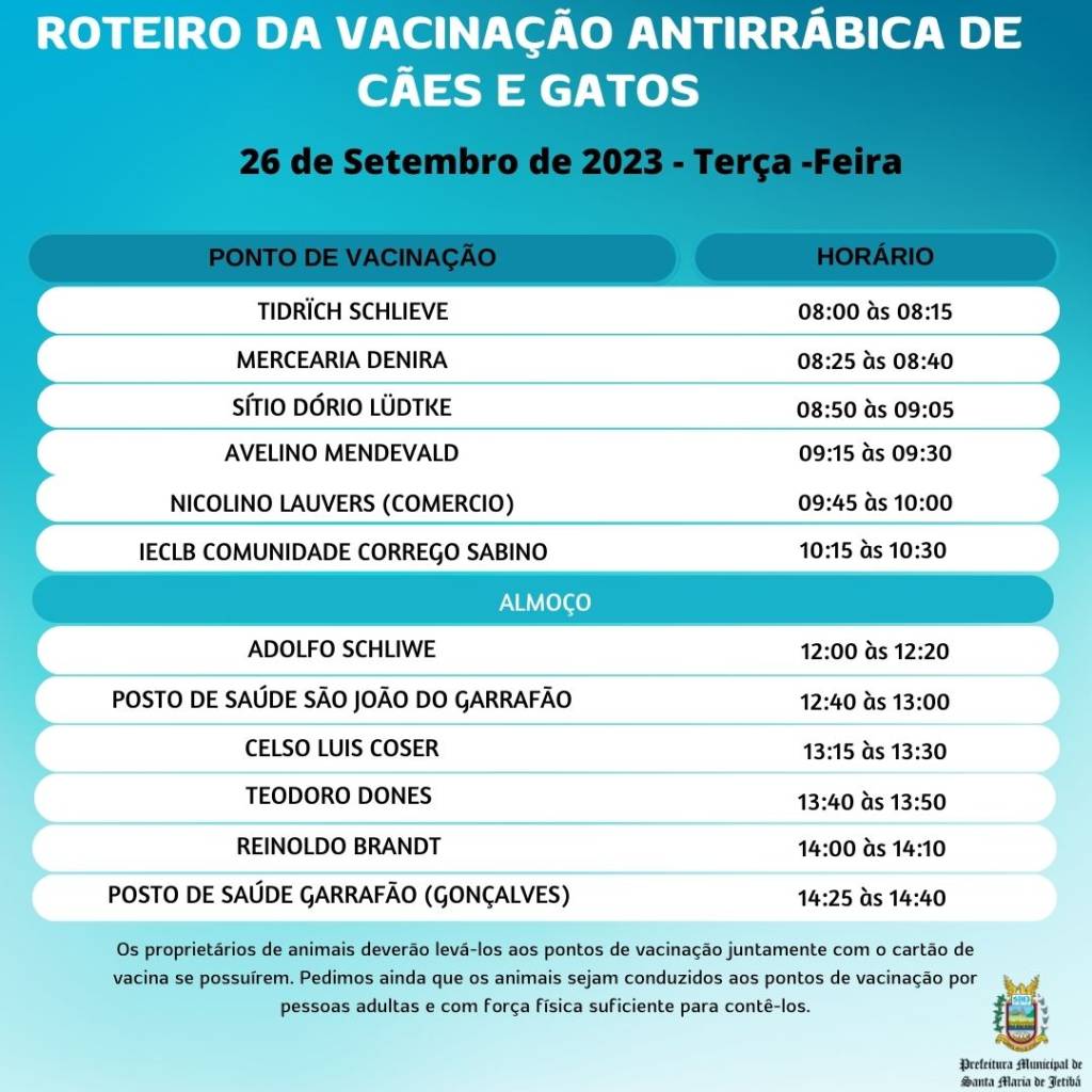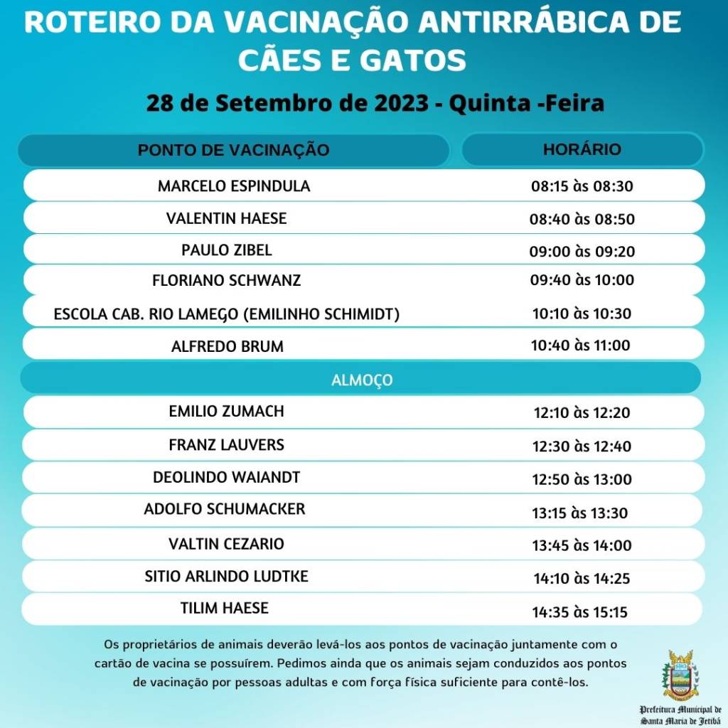 InícioNotíciasCAMPANHA DE VACINAÇÃO ANTIRRÁBICA DE CÃES E GATOS CAMPANHA DE VACINAÇÃO ANTIRRÁBICA DE CÃES E GATOS Publicado em 21/08/2023Por Secretaria Municipal de Saúde CONFIRA O ROTEIRO