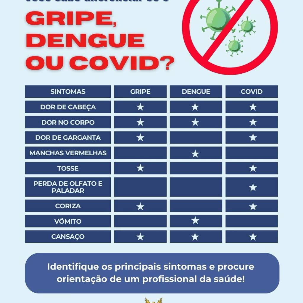 InícioDengueVocê sabe identificar se seus sintomas são de gripe, dengue ou covid? Você sabe identificar se seus sintomas são de gripe, dengue ou covid? Publicado em 01/03/2024Por Secretaria Municipal de Saúde Fique atento e procure orientações de um profissional da saúde.