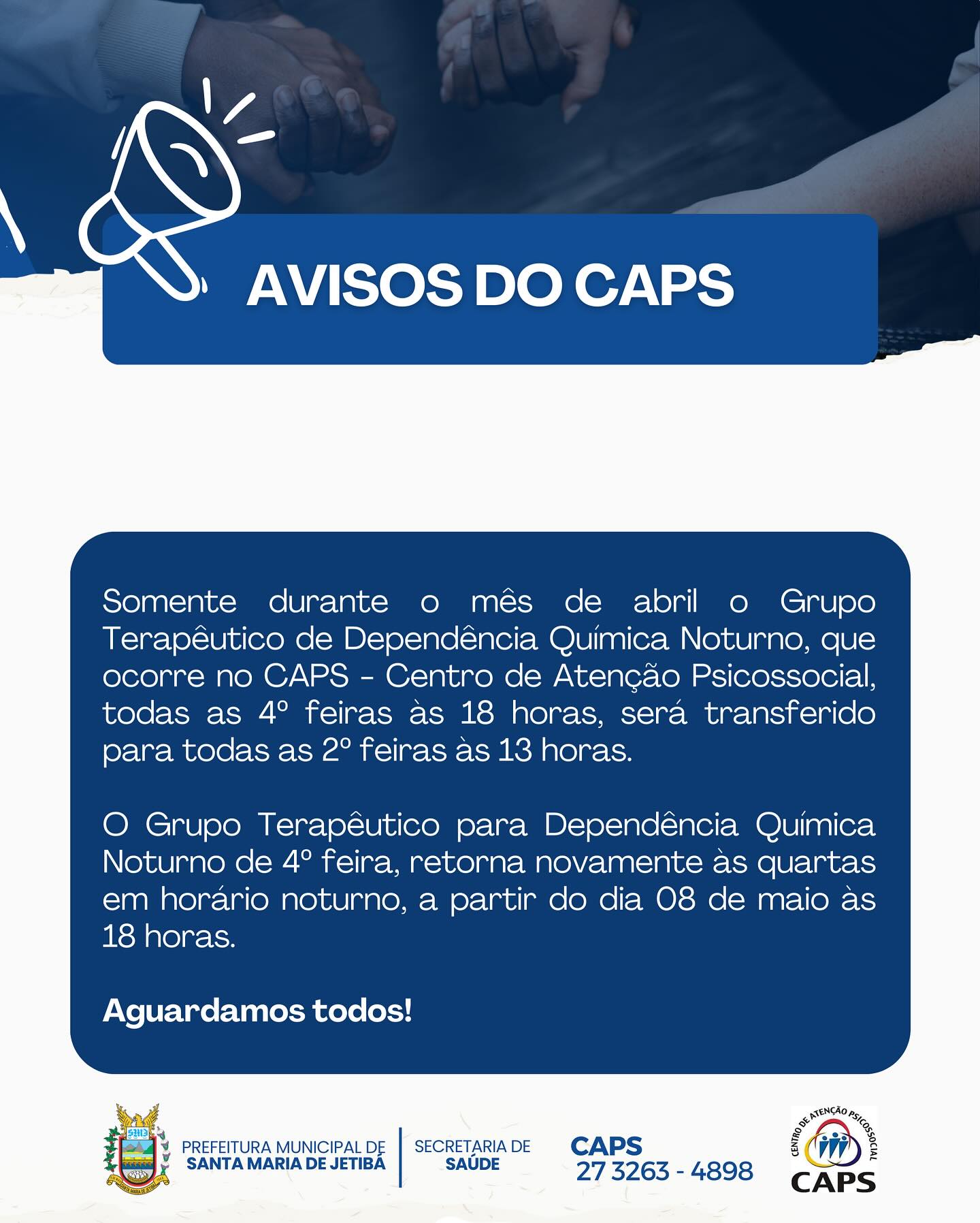 Somente durante o mês de abril o Grupo Terapêutico de Dependência Química Noturno, que ocorre no CAPS – Centro de Atenção Psicossocial, todas as 4º feiras às 18 horas, será transferido para todas as 2º feiras às 13 horas.