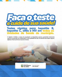 A Prefeitura de Santa Maria de Jetibá oferece testes rápidos gratuitos para hepatite B, hepatite C, sífilis e HIV em todas as Unidades de Saúde do município. Simples Seguro Sigiloso Resultado em poucos minutos Fazer o teste é um ato de cuidado com você e com quem você ama. Procure a Unidade de Saúde mais… Continue lendo Cuide da sua saúde!