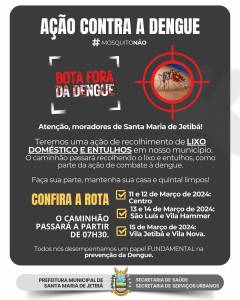 Em Santa Maria de Jetibá, estamos unindo esforços para combater uma ameaça séria: a dengue. A Prefeitura Municipal, através das Secretarias de Saúde e Serviços Urbanos, está liderando uma ação conjunta para enfrentar esse desafio. De 11 a 15 de março de 2024, estaremos realizando uma grande campanha de limpeza em todo o município. Nosso… Continue lendo A união faz a força!