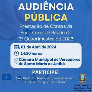 Prestação de Contas da Secretaria de Saúde referente ao 3º quadrimestre de 2023! Será na segunda-feira, 01 de abril de 2024, às 14h, na Câmara Municipal de Vereadores. Sua presença é fundamental para acompanhar e contribuir com a transparência e eficiência na gestão da saúde.