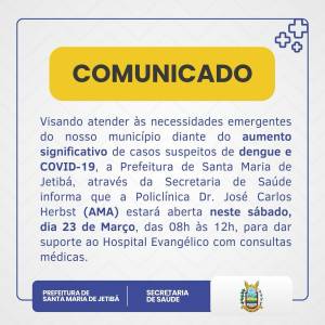 Visando atender às necessidades emergentes do nosso município diante do aumento significativo de casos suspeitos de dengue e COVID-19, a Prefeitura de Santa Maria de Jetibá, através da Secretaria de Saúde informa que a Policlínica Dr. José Carlos Herbst (AMA) estará aberta neste sábado, dia 23 de Março, das 08h às 12h, para dar suporte… Continue lendo COMUNICADO IMPORTANTE!