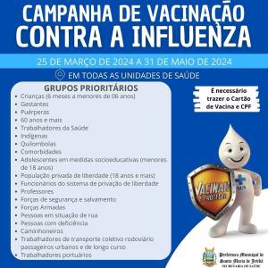 De 25 de março a 31 de maio de 2024, todas as unidades de saúde estarão promovendo a Campanha de Vacinação contra a gripe. Garanta sua imunização trazendo seu CPF e Cartão de Vacinação.