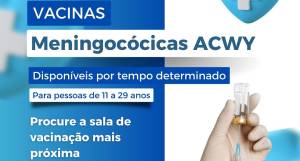 A Municipalidade, por meio da Secretaria Municipal de Saúde, convida os jovens de 11 a 29 anos de idade a tomar a vacina MENINGOCÓCICA ACWY. Procure o Posto de saúde mais próximo. A Secretaria de Saúde reforça a importância da imunização como medida fundamental para a promoção da saúde pública. Vacinas salvam vidas!