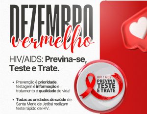 A campanha “Dezembro Vermelho” reforça a importância da conscientização sobre o HIV/Aids. Vamos juntos fortalecer a prevenção, promover a testagem e garantir o acesso ao tratamento para todos! Mensagens principais: Prevenção é prioridade Testagem é informação Tratamento é qualidade de vida! Teste rápido disponível: Todas as unidades de saúde de Santa Maria de Jetibá realizam… Continue lendo DEZEMBRO VERMELHO: HIV/Aids – Previna, Teste e Trate!
