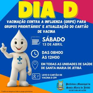 Proteção em Ação! Dia D de Vacinação contra a Influenza e Atualização do Cartão de Vacinação para Grupos Prioritários. Sábado, 13 de abril, das 08h às 12h, em todas as unidades de saúde de Santa Maria de Jetibá. Traga seu cartão de vacinação e CPF e fortaleça sua imunidade contra a gripe. Sua saúde é… Continue lendo Dia D de Vacinação