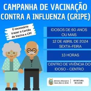 A vacinação contra a gripe para idosos de 60 anos ou mais começa nesta sexta-feira, dia 12 de abril, a partir das 13h, no Centro de Vivência do Idoso, do centro. Junte-se a nós e garanta sua proteção contra a influenza. Sua saúde em primeiro lugar!